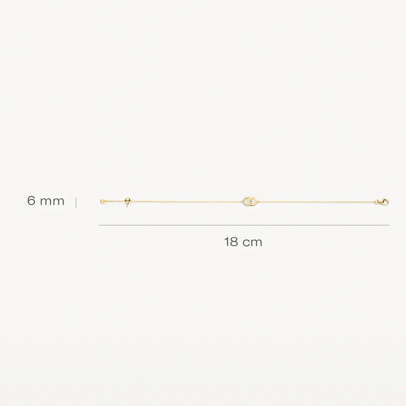 Dieses elegante Armband aus 585er Gelbgold wird von zwei ineinandergreifenden Ringen geschmückt, von denen einer mit Zirkoniasteinen besetzt ist. Das Armband hat einen Karabinerverschluss und eine Gesamtlänge von 18 cm. Das passende Geschenk, um sich selbst eine Freude zu bereiten oder als Zeichen der Verbundenheit für einen geliebten Menschen.