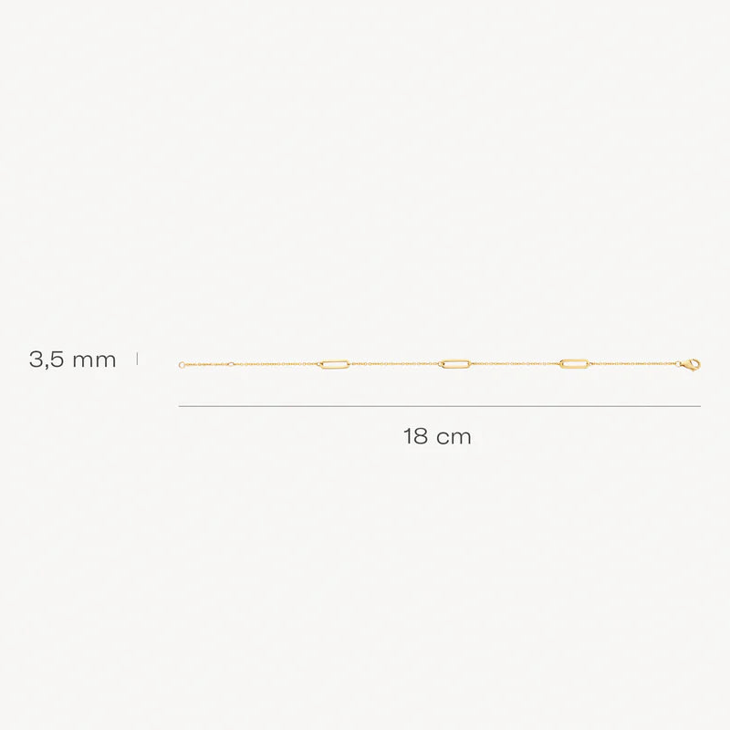 Dieses elegante Armband besteht aus feinen, kleinen Gliedern, die sich mit drei größeren, länglichen Gliedern abwechseln. Das Armband wird aus 14 Karat Gelbgold gefertigt und kann sehr gut mit anderem Schmuck aus unserer Kollektion kombiniert werden. Beispielsweise mit dem Collier 3102YGO.