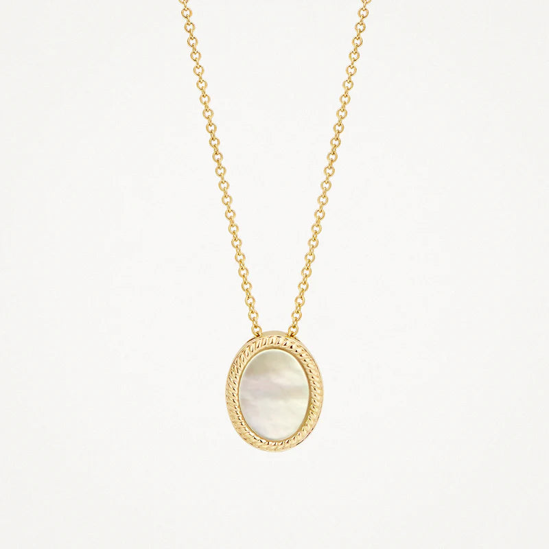 Diese elegante Halskette aus 585er Gelbgold hat einen Anhänger mit Perlmutt, der von einem Zopfmuster umgeben ist. Die Länge der Halskette beträgt 42 cm und der Durchmesser des Anhängers 9 mm. Herrlich allein oder in Kombination mit anderem Schmuck aus unserer Kollektion.