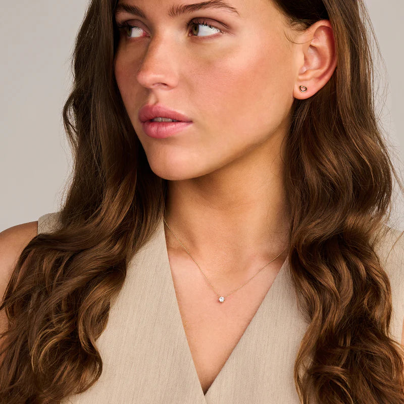 Glitzerndes Collier aus 14 Karat Gelbgold mit Anhänger mit brillantgeschliffenem Zirkonia in Chatton-Fassung. Es ist 42 cm lang und der Durchmesser des Anhängers beträgt 4 mm. Bildhübsch, wenn es allein oder kombiniert mit anderem Schmuck aus unserer Kollektion getragen wird.