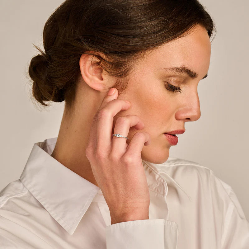Aus 14-karätigem zertifiziertem Recyclinggold gefertigt und mit einem Labordiamanten besetzt. Dieser goldene Lab Diamonds Ring ist in glänzend poliertem Weißgold ausgeführt und mit 3 Labordiamanten im Brillantschliff mit einem Gesamtgewicht von 0,32 ct besetzt. Die Steine sind zusammen 9,1 mm breit. Als Einzelstück getragen, verleiht der Ring eine elegante und feminine Ausstrahlung.